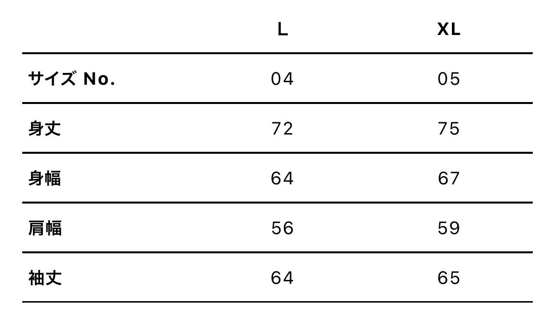 XL 着丈75 / 身幅67 / 肩幅59 / 袖丈65